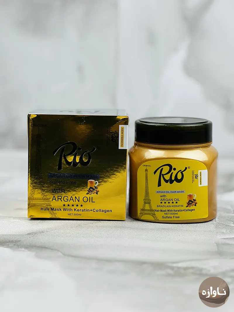 ماسک مو ریو آرگان (Rio Argan) بدون سولفات حجم 500 میل، غنی از کلاژن، کراتین، آرگان و گرد طلا. ترمیمکننده، آبرسان و بازسازیکننده ساختمان مو، با افزایش استحکام و درخشندگی. مناسب موهای رنگشده و آسیبدیده، ضد وز و رفع خشکی مو
